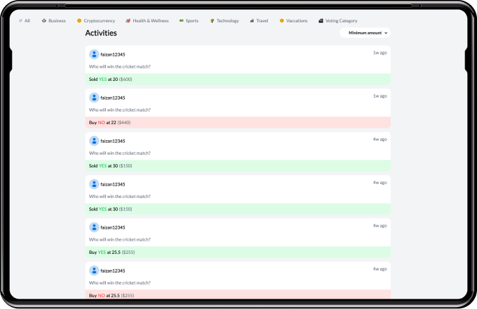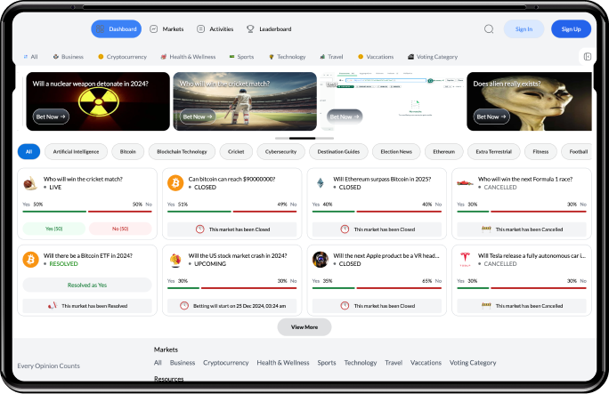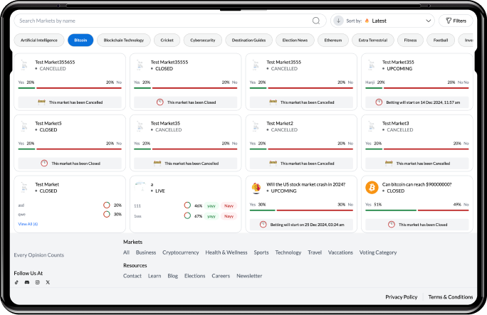 The client envisioned a dynamic prediction market platform, similar to Polymarket, allowing users to place bets on political outcomes, stock and cryptocurrency movements, and other real-world events. The platform needed to aggregate large volumes of user predictions and market data, providing real-time analytics to calculate and display outcome probabilities.